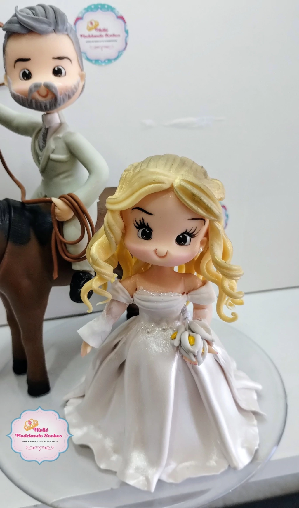 Topo de Bolo Noivos com cavalo– uma peça artesanal única, feita com muito amor e atenção aos detalhes. Personalizamos seu topo de bolo conforme suas preferências, incluindo profissões, hobbies e características especiais do casal.